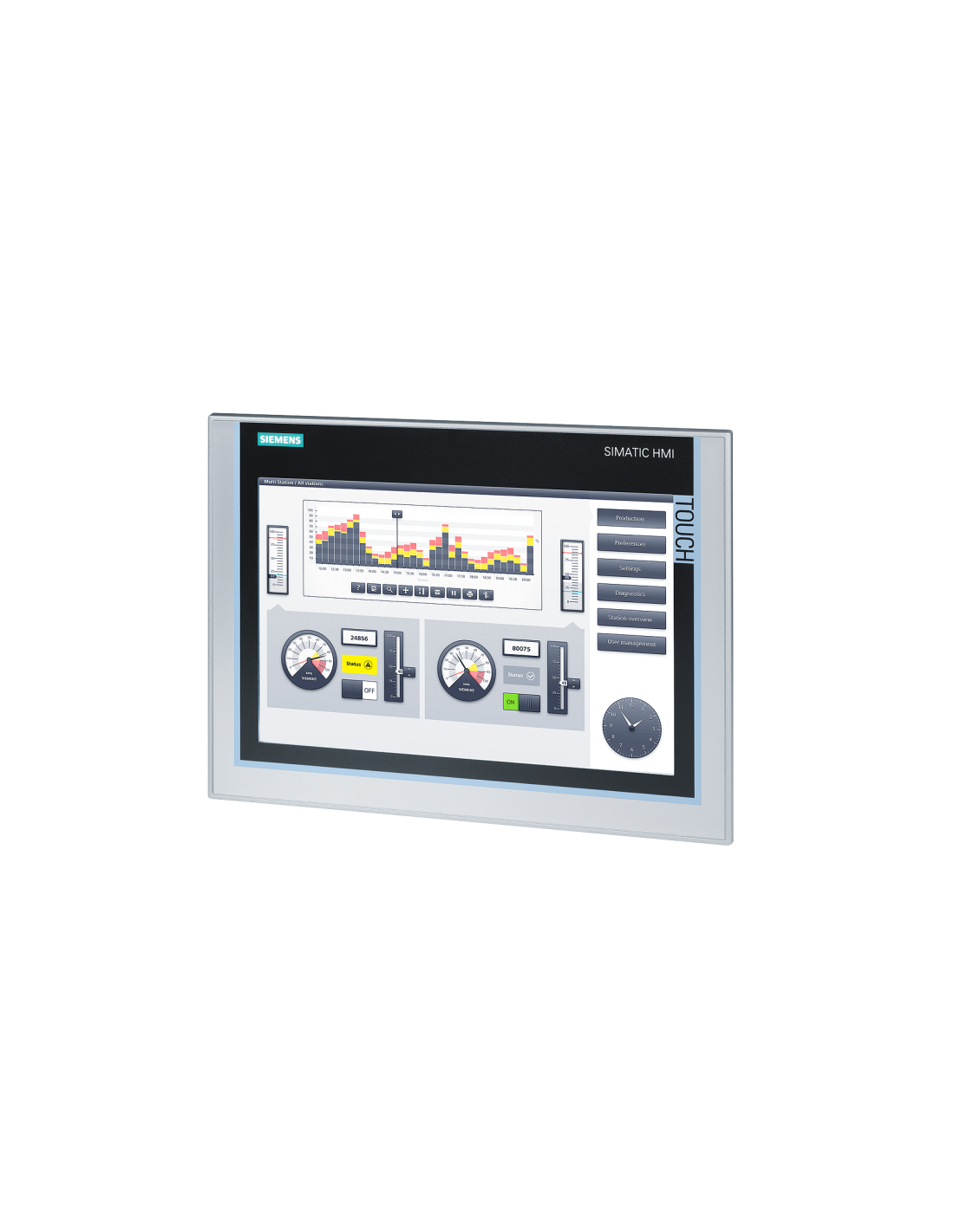 Die hohe Auflösung, 16 Millionen Farben und ein breiter Betrachtungswinkel von bis zu 170° sorgen für hervorragende Lesbarkeit und ein detailliertes Bild des Prozesses bereits auf Maschinenebene. Maximierte Lebensdauer des Displays dank der Möglichkeit, die Helligkeit der LED-Hintergrundbeleuchtung zu steuern. Der Bildschirm kann um bis zu 100 % abgedunkelt werden, um sich an alle Lichtverhältnisse anzupassen. Das PROFIenergy-System überwacht kontinuierlich die Spannung in allen Automatisierungskomponenten und bietet durch die Integration in bestehende Standards den besten Investitionsschutz. Diagnosesysteme erfordern keine zusätzlichen Kosten oder zusätzliche Geräte mehr. Nach dem Anschluss an SIMATIC-Steuerungen können die Diagnoseinformationen bereits über das Comfort-Panel ausgelesen werden.