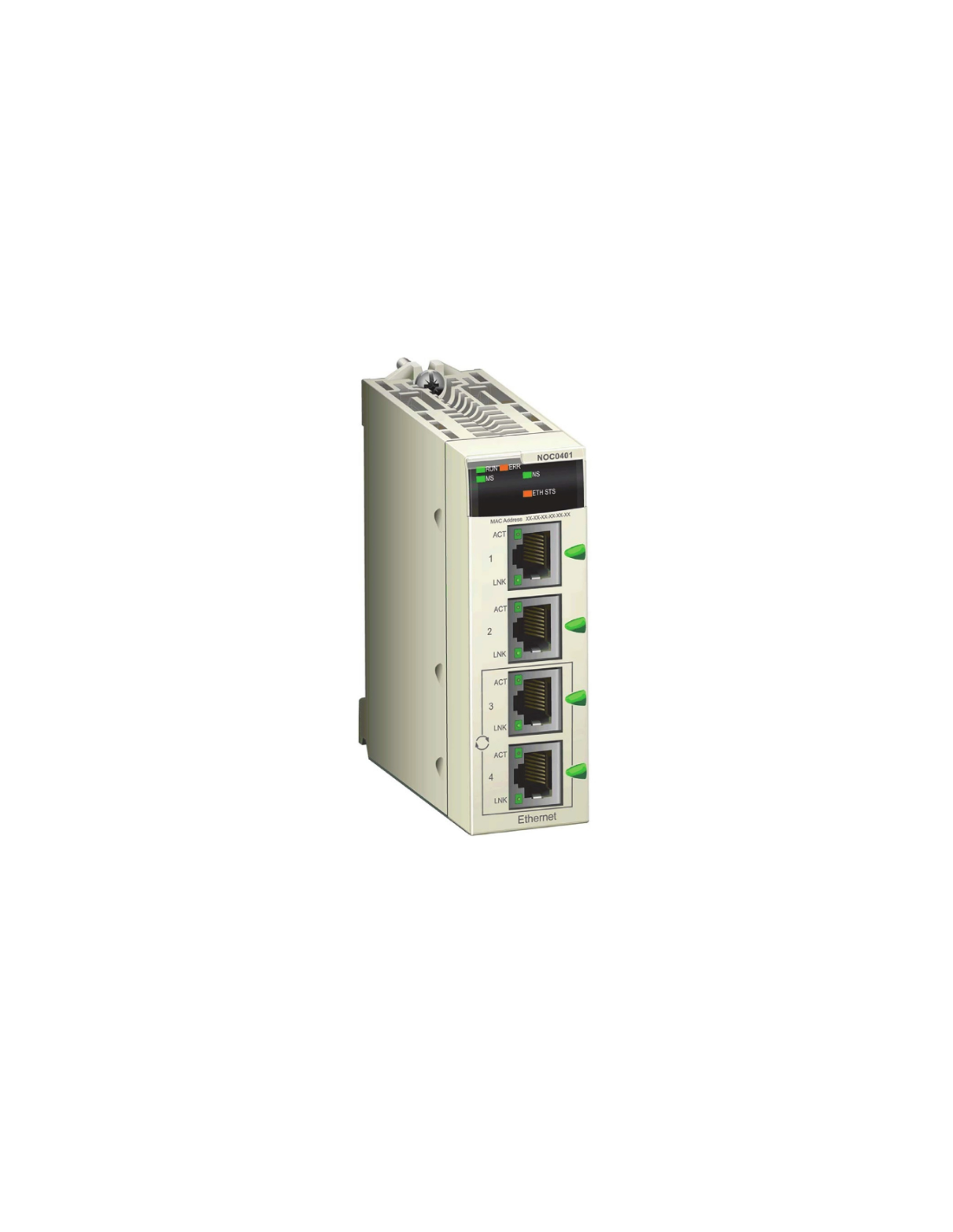 Das Ethernet-Kommunikationsmodul Schneider Modicon X80 – BMXNOC0401 ermöglicht die Verbindung einer SPS mit einem Ethernet-Netzwerk. Es ermöglicht die Kommunikation und den Datenaustausch zwischen anderen Geräten im Netzwerk, wie z. B. Computern, Bedienfeldern, anderen SPSen, Überwachungsgeräten oder sogar Cloud-Systemen. Das Modul BMXNOC0401 unterstützt verschiedene Ethernet-Kommunikationsprotokolle wie TCP/IP, UDP, Modbus TCP und andere. Dadurch kann es in verschiedene industrielle Automatisierungssysteme integriert werden. Es verfügt über vier (4) Ethernet-Ports, die den Anschluss an verschiedene Netzwerke oder Geräte innerhalb eines industriellen Netzwerks ermöglichen. Das Modul ist für die Montage auf einer DIN-Schiene ausgelegt, was eine einfache Integration mit anderen Geräten im Schaltschrank ermöglicht.| Kommunikationsmodul | |