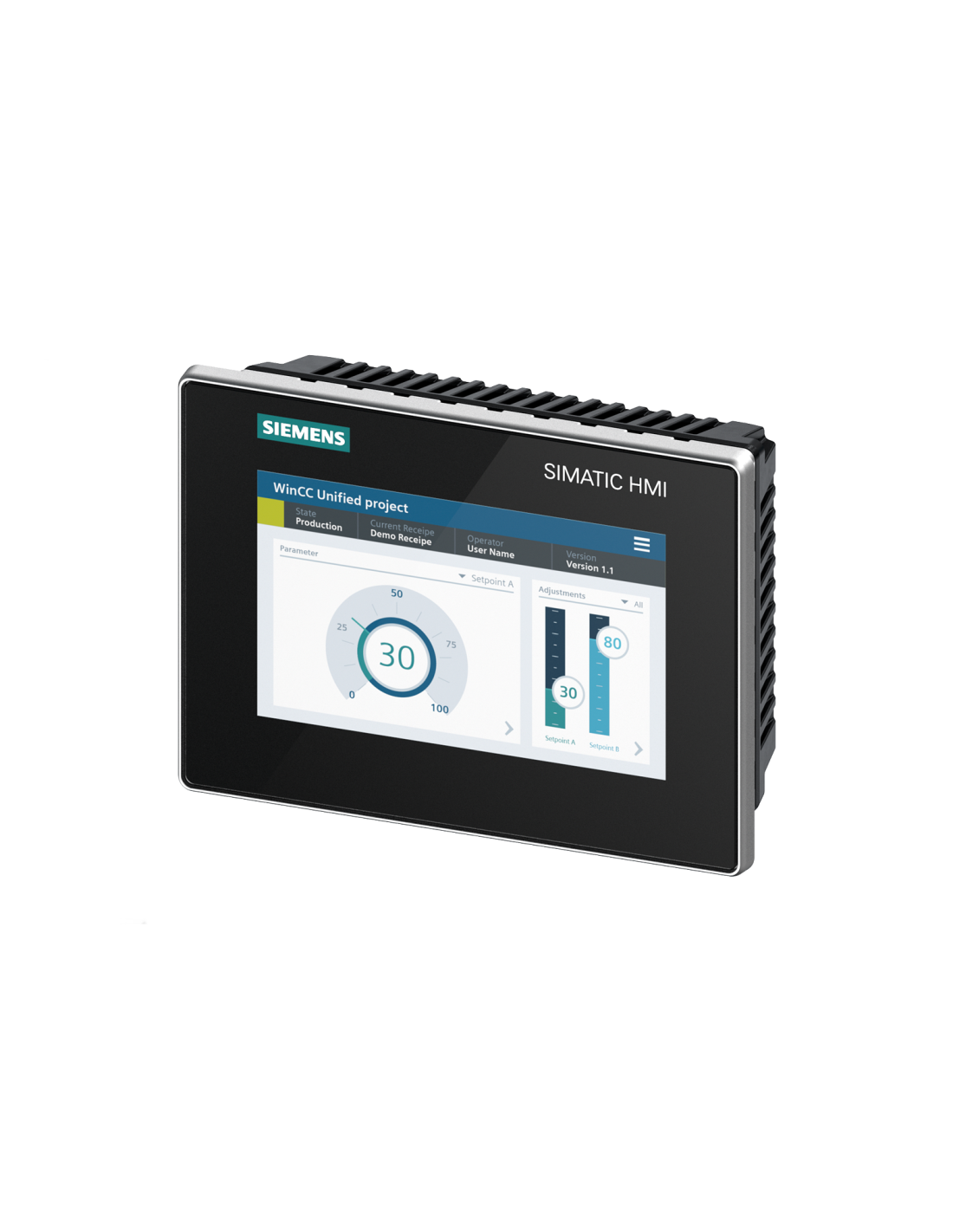 Das Panel ist mit einem 7-Zoll-TFT-Panorama-Display (Widescreen) mit 16 Millionen Farben und einem Touchscreen ausgestattet, der eine direkte Bedienung der Visualisierung ermöglicht. Die PROFINET-Schnittstelle gewährleistet die Integration in SIMATIC-Steuerungssysteme und die Kommunikation in industriellen Ethernet-Netzwerken. Die Projektierung und Konfiguration der HMI-Anwendung erfolgt in der Umgebung WinCC Unified Comfort, verfügbar ab Version V16, was die Konsistenz der Projektierung und Diagnose innerhalb der SIMATIC-Plattform gewährleistet.